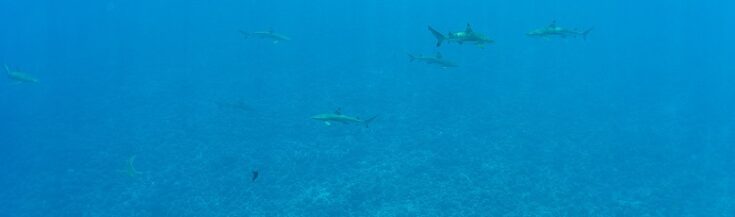The first stop for the day is a place where you can snorkel with reef sharks and a lemon shark with hundreds of smaller fish around you.