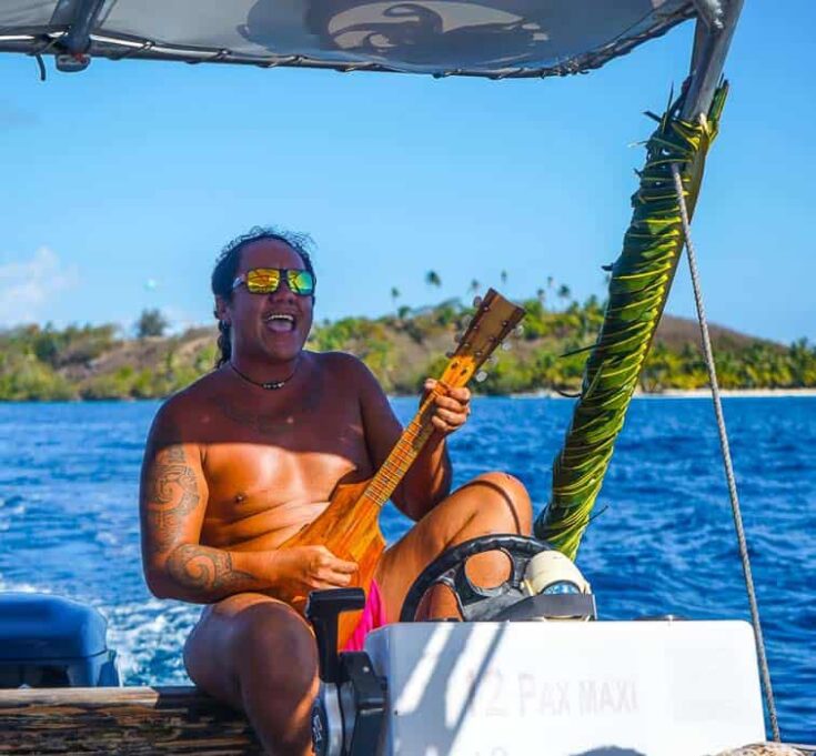 The boat driver and guide for the day is a local Tahitian man wearing a traditional-looking g-string while playing the ukulele, singing, and steering the foot with his foot.